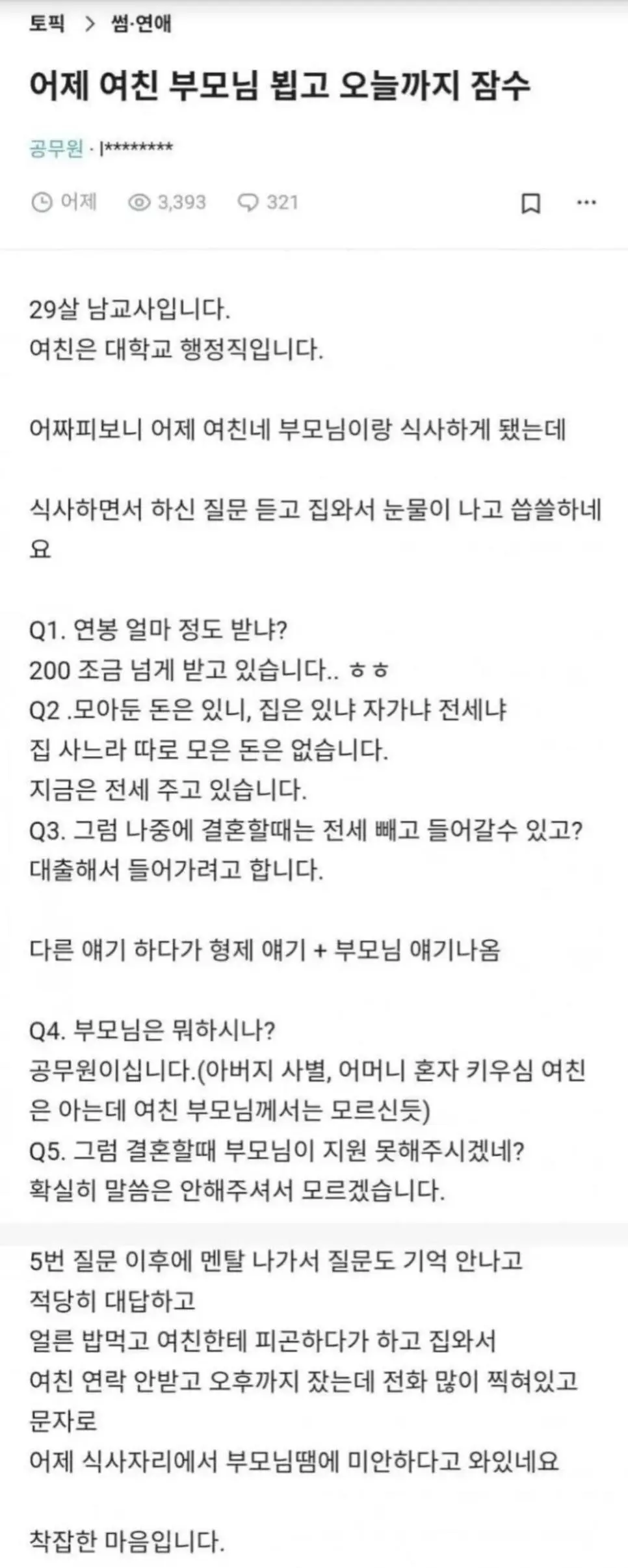 여친 부모님과 식사 후 잠수탄 29살 남교사